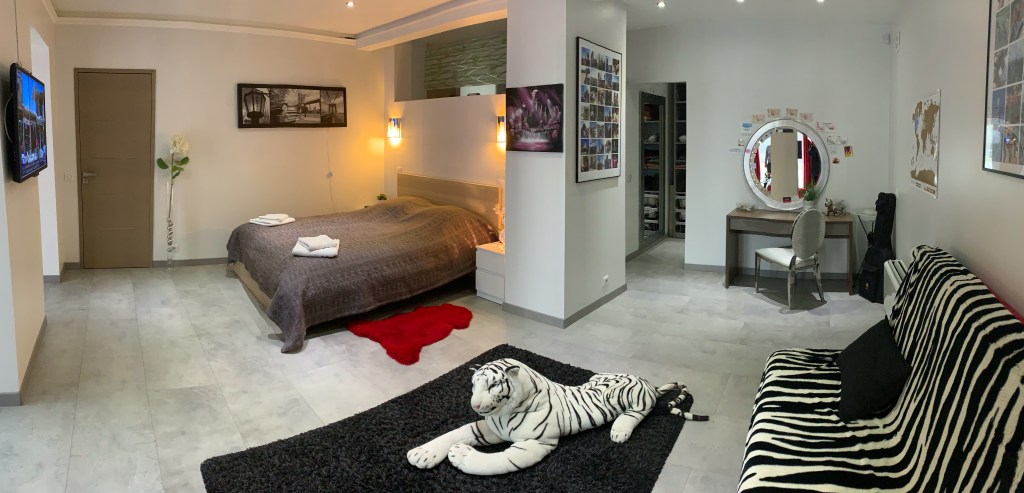 1 king size bedroom (60 square meters) with a queen size bed (160cm), 2 convertible sofas of 140cm each, dressing room, study corner. 2 TV and 2 AC